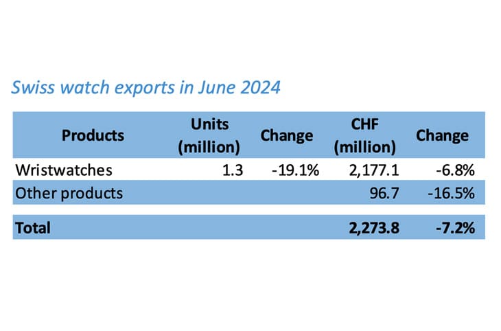▲瑞士鐘錶業聯合會(FH)公佈的瑞士手錶2024年6月出口表現。