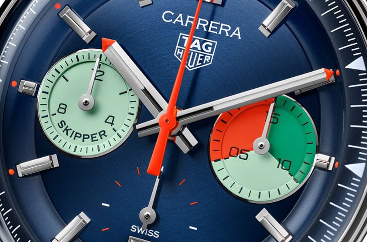 如果扣掉两枚计时小表盘的鲜艳配色,Carrera Skipper帆船计时码表会和一般的Carrera计时码表差不了多少,因此这关键的点缀顏色充满耐人寻味的意义。从手表创作渊源不难猜想它和当初的Skipper计时码表有关,因为如果上网找历史原作的图片就会发现这配色的模式有新旧传承的味道,据说泰格豪雅之所以会採用这样的设计是要用蓝色来代表大海,而分钟计时盘有三个5分钟区块形成共15分钟的倒数计时功能,用以突显并倒数帆船赛「起航前」的关键时刻,尤其指针数到亮橘色时,代表比赛仅剩5分钟即将开始,提醒帆船选手们要保持绝对专注;在两枚小表盘都出现的湖水绿色用来呼应无畏号的甲板色彩,而深绿色代表船上的索具顏色,亮橘色的部分作为和蓝色高度对比的顏色,警示提醒的意义不言而喻。