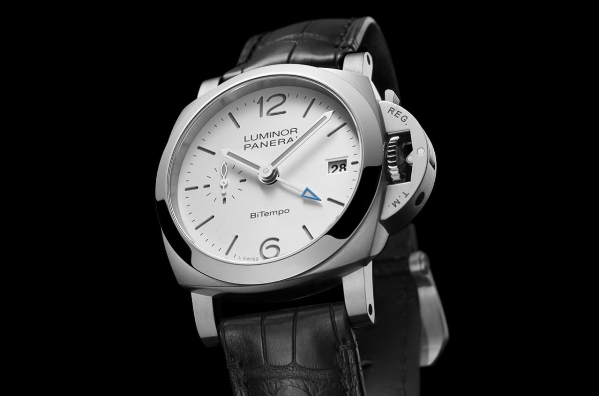 PAM01367的白色面盤屬於市場接受度高、搭配性強,又很耐看的選擇,手錶的面盤格局簡單俐落:9點方向設有小秒盤、面盤中央軸心除了時、分指針,還有一枚12小時繞一圈的兩地時間指針(針尖是藍色)。面盤6點方向印有”BiTempo”字樣,這是義大利文的「雙時區」之意,既能點出手錶的主要功能性,又再度彰顯品牌源自義大利的血統,還可以由此表現出品牌手錶和其他家不同的獨特個性。白面PAM01367三明治面盤的夜光塗層與黑面不一樣,前者是灰色Super-Luminova®材質,在細節處展現兩種版本的變化性。據知沛納海調整過手錶的日期顯示窗,因此佩戴者閱讀日期資訊時會更清楚好認,日期窗部分會隨面盤顏色有所差異,例如黑面的日期盤為黑底白字、白面則是相反設定,黑白兩色的高對比感有助於讓人看得清楚又快速。