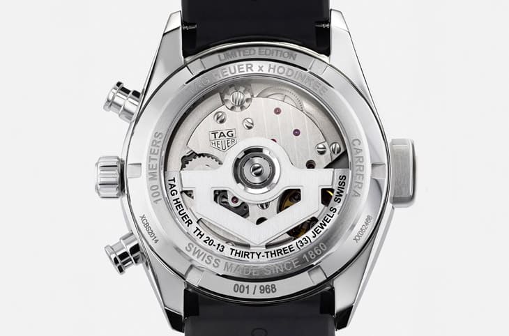 錶款搭載TH20-13自動機芯,因為它多了潮汐顯示功能,因此機芯設計也就是在TH20系的基礎上再多加些複雜功能模組升級而成,本質上它和泰格豪雅現代基礎機芯的規格沒有不同,例如4hz震頻、動力儲存80小時等,而它的計時功能以導柱輪搭配垂直離合機制,這也是泰格豪雅計時碼錶的標準組合。手錶透明底蓋上、下方邊緣的地方分別刻有"TAG HEUER x HODINKEE"字樣和手錶的限量編號,展現出這款錶獨特的收藏意義。