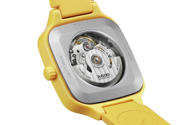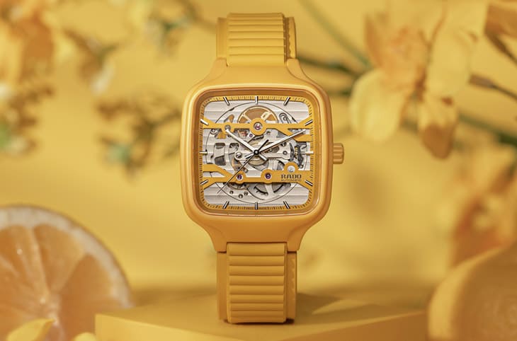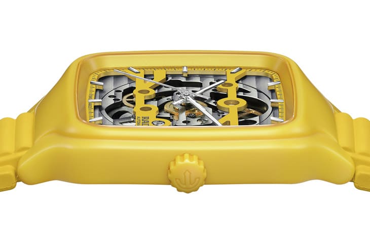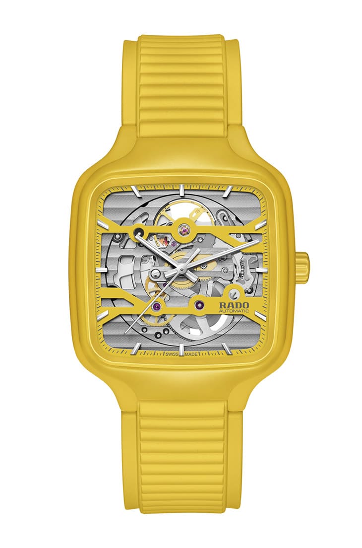 真我方形系列鏤空錶新作以霧面黃色高科技陶瓷打造錶殼,這種顏色自然讓人聯想起黃色的太陽,要用高硬度的陶瓷做出其帶有圓角設計的矩形錶殼並不容易,但是雷達表不只能研發出色彩搶眼的陶瓷,也能靈活將陶瓷製作成自己想要的樣子。
