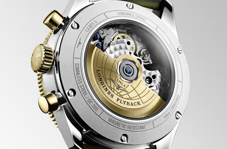 錶款搭載的L791.4機芯呼應錶殼的半金材質,特別將自動盤鍍上金色,盤面上同樣刻有系列代表性的地球圖案與功能特色,這枚機芯的內部蘊含矽游絲與品牌創新研發的新式零件,能確保手錶抗磁性能達到比ISO 764標準要求的十倍以上,機芯的擺輪震頻為4Hz、動力儲存有68小時,走時精準度一如前面提及有COSC認證掛保證,此外手錶的計時功能還達到飛返的進階等級,由此在計算連續事件時,手錶的計時成果也能從中提高即時性與準度。