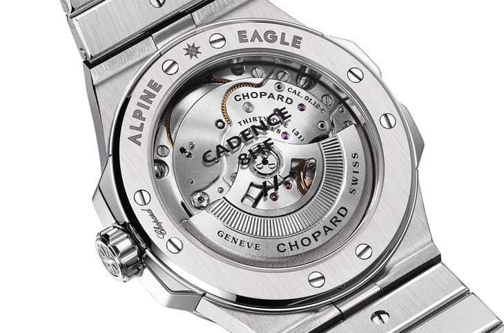 腕錶背面透明底蓋印有黑色的"CADENCE 8HF"字樣以及高震頻箭頭標誌,於此露出的01.12-C自動機芯秉承蕭邦2012年研發的L.U.C 01.06-L機芯家族血統,它也成為Alpine Eagle系列首度引進高震頻機芯的基石。Alpine Eagle系列三針錶原本搭載的01.01-C已具備現代主流規格的4Hz(28,800轉)震頻,然而蕭邦早在開發出L.U.C 01.06-L機芯時就已經明示過高震頻以加速擺輪運作速度的方式有助於降低腕錶受到撞擊時影響擒縱系統走時的規律性與穩定性(由於擺輪作動速度快,即使機芯受到撞擊,它也能用更短的時間回復正常運作),因此01.12-C機芯的震頻直接提升數個檔次達到8Hz(57,600轉)的水準!放眼錶壇很少震頻達到相同水準的機芯作品,01.12-C機芯採用單晶矽片製作擒縱叉、擒縱輪和機板銷釘等重要零件,這些零件為了提升震頻而快速運作時,相對地也會更頻繁地產生摩擦,然而矽材質既輕巧又超耐磨,可以減少機芯組件對潤滑劑的依賴,由此延長機芯的使用壽命。蕭邦一方面提升機芯震頻,卻還能維持其60小時動能不墜,無論內外整體性能都經過深度優化,賦予Alpine Eagle更可靠、強悍的佩戴實用性。