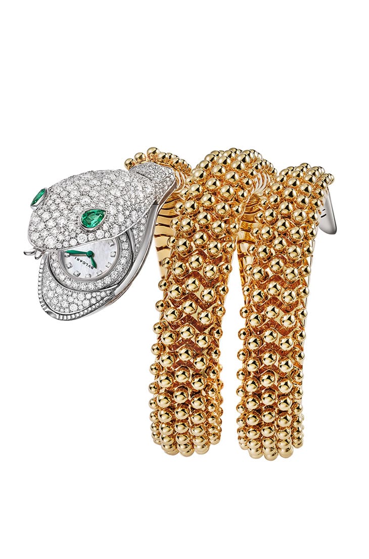 18K白金、18K黃金材質/BVL 100 Piccolissimo手動上鍊機芯/時、分顯示/錶款鑲鑽602顆,約重7.53克拉,蛇眼鑲梨形切割祖母綠2顆,約重0.48克拉/藍寶石水晶鏡面