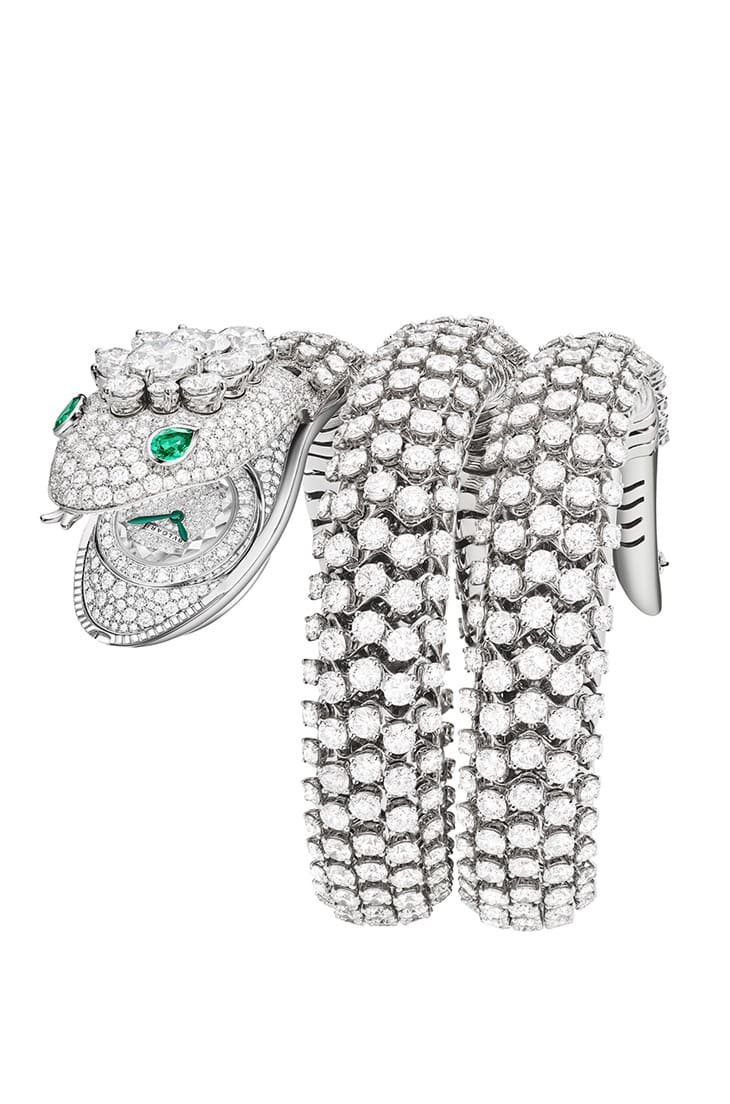 18K白金材質/BVL 100 Piccolissimo手動上鍊機芯/時、分顯示/錶款鑲鑽1,057顆,約重54.59克拉,蛇眼鑲梨形切割祖母綠2顆,約重0.47克拉/藍寶石水晶鏡面
