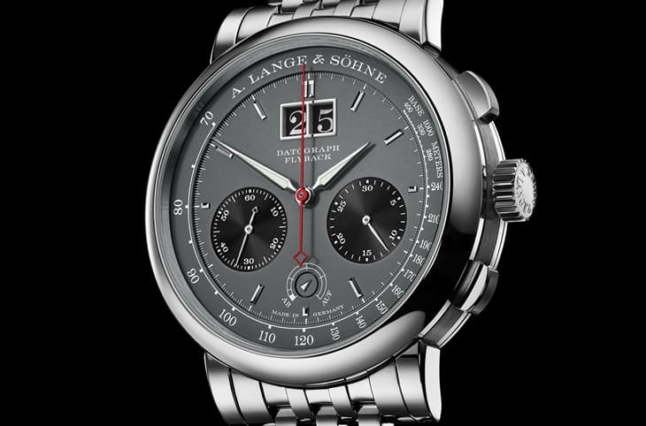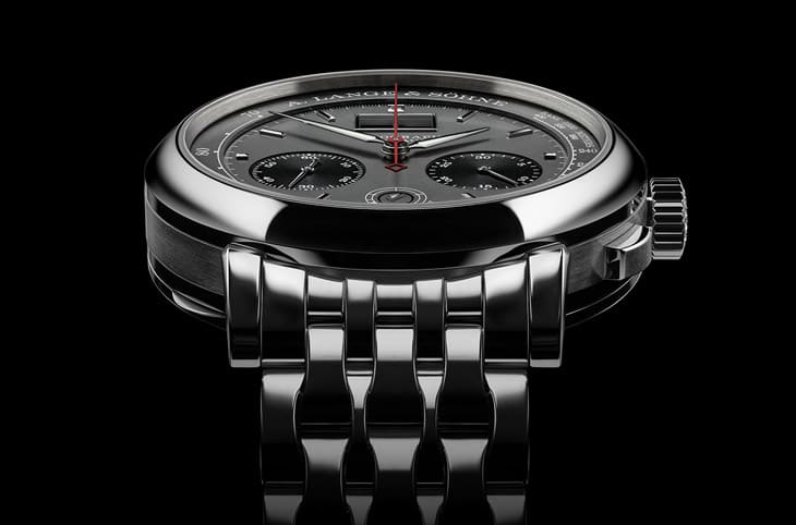 在熟悉的面盤格局中,面盤、小錶盤和大日期轉盤的顏色相對低調,可是卻也帶有一定的對比性,讓人可以清楚辨識手錶各種功能,朗格特別將中央計時大秒針改成紅色,如此一來它在計時功能啟動時會非常有存在感,呈現出時間轉瞬即逝的緊湊節奏,,此外像是時、分指針以及小巧的動力儲存顯示指針都覆有夜光塗層,別忘了面盤外圍還有測速計刻度,然後手錶又配置了白金鍊帶,整體形象其實和《Concours of Elegance》古董車展的主題也都對應得到。