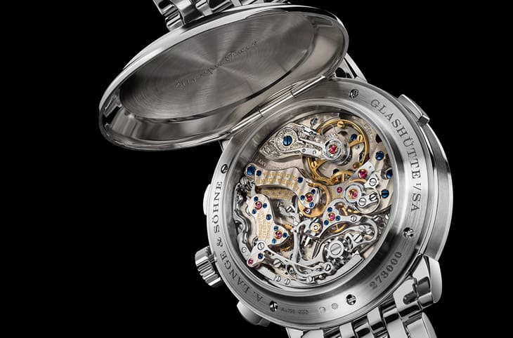 翻到錶背會繼續發現更多朗格精心設計的橋段,軍官式底蓋直接刻上《Concours of Elegance》古董車展的標誌與字樣,不知道的人還以為這款是為了車展而創作的特別版。底蓋掀開時是由下往上,開蓋後手錶內部的L951.6映入眼簾讓人驚嘆,這枚手上鍊機芯由451枚零件組成,一看它密密麻麻的零件便能感受到機芯與眾不同的複雜度,尤其計時功能相關組件如導柱輪在此看得很清楚,還有品牌代表的德國製錶工藝精華像是未經處理德國銀製成的橋板、黃金套筒、鵝頸式微調以及手工雕刻襬輪夾板等等,在在強化了機芯經過長時間用心製作後的高工藝質感,而且複雜度和精緻度如此高的機芯,朗格也還是遵照自家傳統經過了兩次組裝工序,確保機芯品質可以達到近乎完美的水準。