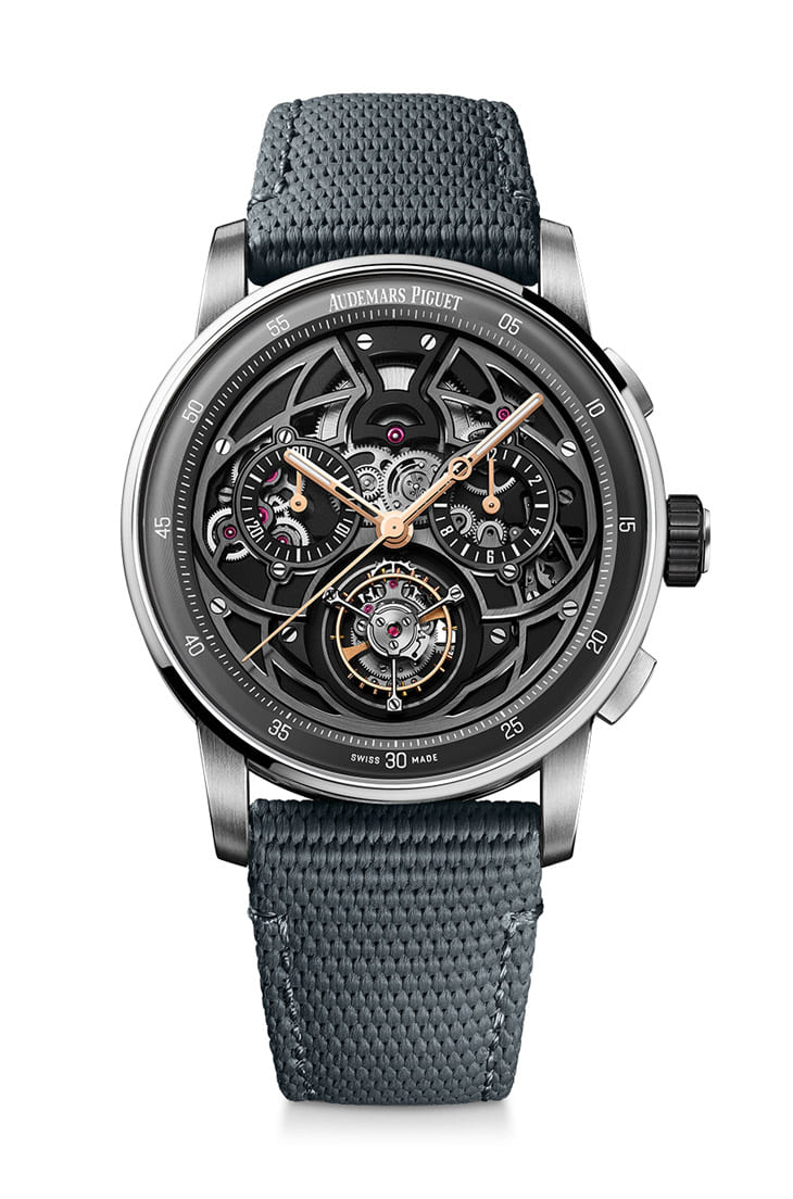 AUDEMARS PIGUET愛彼CODE 11.59系列旗下功能相對複雜的自動上鍊飛行陀飛輪計時碼錶相隔2年後近期推出最新改款,手錶繼上一回的玫瑰金搭配黑色陶瓷組合後,2024年則是換成白金材質與黑色陶瓷搭配,加上鏤空面盤的顏色也有相應變化,賦予手錶同中求異的微妙新意。