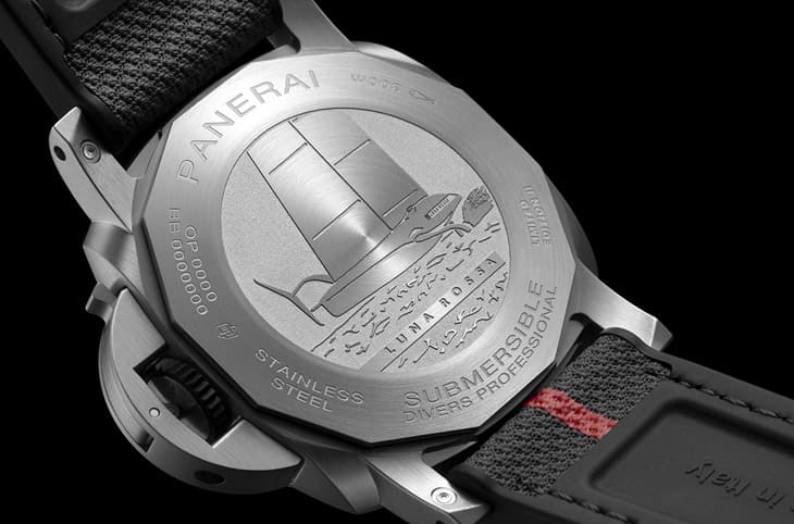 手錶背面的實底蓋刻上了Luna Rossa AC75帆船圖案,品牌運用陽刻的方式,讓AC75帆船圖案像是浮在實底蓋的磨砂背景上,同時在畫面下方也還刻出了長短不一、造型各異的線條,用來詮釋出波光粼粼的海面,彷佛帆船隊就正在我們眼前迅速前進,一切就為了在美洲盃中展現出平日努力訓練的成果、一舉締造佳績。