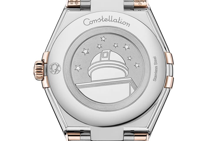 面盤上鑲嵌12顆鑽石作為時標,6點方向鑲有象徵星座系列的立體星星圖案——前述面盤的放射紋就是從星星圖案往四面八方蔓延,而其實歐米茄已經不是第一次使用這種面盤裝飾,早在2008年時品牌就已經推出過帶有這種設計的星座女錶;相隔16年後,歐米茄又再度把這種讓人看得心情愉悅的圖案帶回星座系列中,包括珍珠母貝面盤在內,據說這次三種尺寸的星座系列女錶將會有多達20種顏色詮釋同樣的紋路。