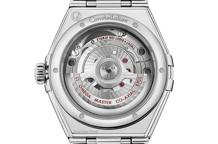 手錶外觀造型乍看如出一轍,但其實搭載石英機芯或機械機芯,從面盤6點方向有沒有日期顯示窗便能夠粗略分辨,此外石英機芯款皆為二針顯示,而機械機芯則為三針顯示,這些功能的差異剛好透露出不同的機芯類型。翻至錶背,石英機芯皆為實底蓋,其上刻有星座系列著名的天文台徽章,這是歐米茄早期彰顯手錶高精準度的代表圖騰。29mm的機械機芯款搭載的是8700自動機芯,這枚小巧的機芯體積小但各方面性能、規格與歐米茄主力的大師天文台認證皆相同,包括15,000高斯抗磁力、震頻3.5Hz,動力儲存50小時也尚算夠用,比起石英款式的背面圖案,機械機芯款擁有透明底蓋可以一窺機芯零件的打磨修飾,也能見到零件如自動盤、擒縱系統運作的動態,視覺上的滿足感絕對更上層樓。