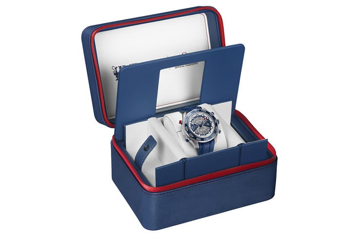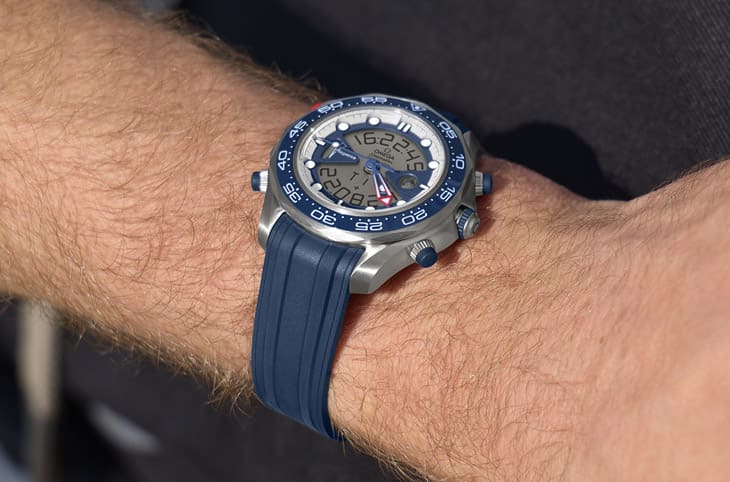 海馬Regatta手錶以鈦金屬製作,它的錶殼達到46.75mm的碩大程度,而且防水性能也有50米水準,針對帆船賽選手在比賽過程中難免會被海水潑濺到的情況做足充分準備。歐米茄替手錶配置了藍色橡膠錶帶,而錶帶背面接近錶殼處可見歐米茄專利快速更換系統(Quick-Change Quick-Change),因此錶主若想要更換錶帶非常輕鬆,不需任何工具即可徒手完成。