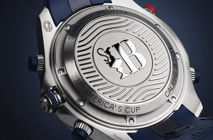 ▲鈦金屬實底蓋刻有亥姆霍茲共振原理波紋圖案,強調手錶內部設有共振腔以提升聲音提示的效果,同時底蓋也刻有第37屆美洲盃帆船賽的標誌。