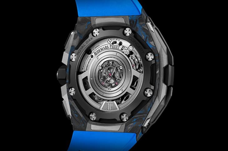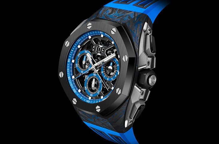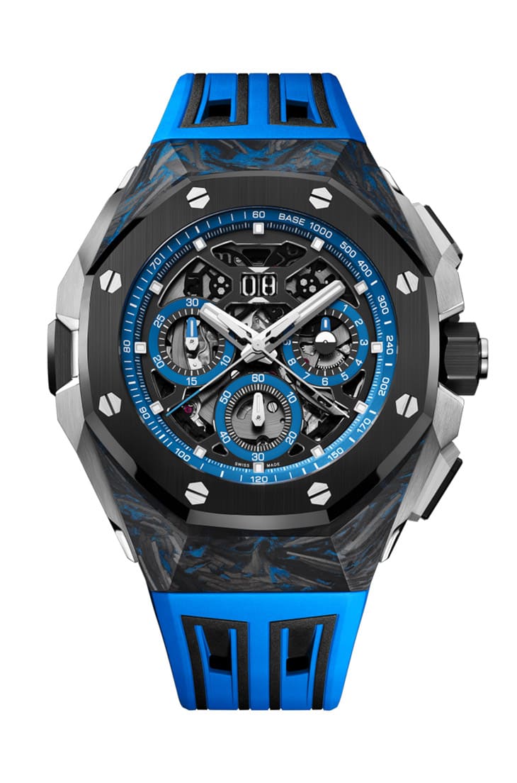 開面設計的面盤與前作一致,不過不同於前作呈現黑、灰雙色為主的低調設計,新款皇家橡樹概念雙追針GMT大日期計時碼錶將面盤外圍的測速計刻度環、小錶盤刻度環都改成藍色,與鏤空的黑色橋板以及灰色調的機芯零件搭配再度強化手錶的彩色風格,其中包括一枚追針指針,計時分針與兩地時間指針等都塗上藍色(小秒針則還是金屬原本的銀色調),圍繞著藍色的主體感因此更為強烈。