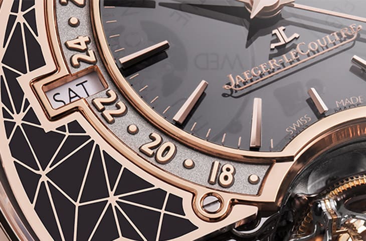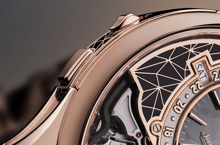 錶款以玫瑰金製作,光是錶殼部分就有80多枚零件,積家在眾多零件表面分別施以拋光、磨砂或微噴砂修飾,特別是錶側非常值得一看:錶耳側面挖出凹陷層次並且以微噴砂工藝點綴,靠近錶冠與三問按把之處更是精心鑲上一枚繪有黑漆幾何圖案的機板,一來替手錶增添觀賞性,同時琺瑯裝飾也有面盤設計有互相呼應的意涵。