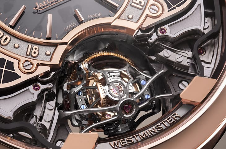 提到球體陀飛輪,超凡複雜工藝大師184機芯手錶身負的球體陀飛輪算一算已經是積家研發的第五代作品,它直接源自2004年問世的Gyrotourbillon,只不過期間歷經數次修改,目前的球體陀飛輪與元祖作品相比,尺寸明顯縮小,結構也變得更精簡——其由94枚零件組成,重量也才0.4克而已,而縮減球體陀飛輪體積的好處可以讓機芯融入三問功能之際,厚度不會跟著堆疊,因此手錶錶殼厚度14.1mm以這種高複雜手錶而言還算適中。令人驚訝的是,超凡複雜工藝大師184機芯手錶除了有球體陀飛輪鞏固手錶的走時精準度,積家還在機芯結構中安排了1分鐘恆定動力裝置,它的作用在於可以穩定地每60秒推動分針跳一格,這樣如果三問功能啟動時,由於分針是瞬跳形式,因此報時裝置便會依據當下指針指示的分鐘數發出聲響,不會有看到和聽到的分鐘數兜不攏的疑慮。
