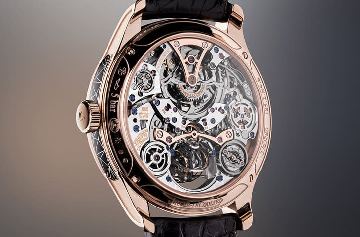 錶背透明底蓋露出零件數多達1052枚的184機芯,這枚機芯的結構有多複雜光用肉眼看便能略窺一二,更讓人陶醉的是,積家在機芯零件上不怕麻煩地施加各種修飾,包括手工倒角、放射狀日內瓦波紋、微噴砂處理與拋光等等,光可鑒人的細膩修飾,完全展現出這枚機芯製作過程有多麽不易,品牌表示製作一枚184機芯需費時5個月時間,而且積家堅持每一枚184機芯的組裝都交由同一位經驗豐富的資深製錶師獨立完成,確保作品的品質保持一致性。