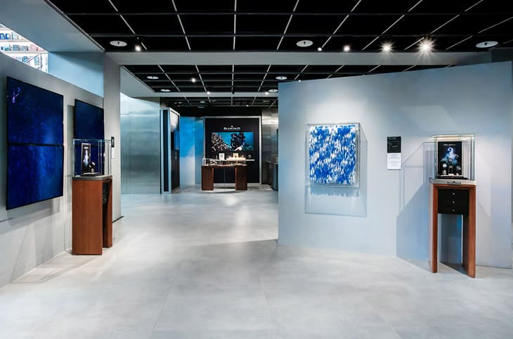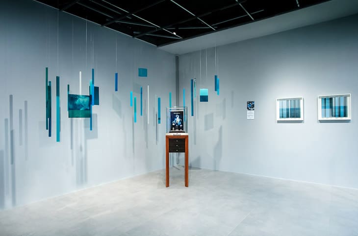 身為本次展覽策展人的胡朝聖以強烈的藍色替寶珀《自然的迴響》品牌藝術展鋪陳展場空間基調,走進展場可見藝術家王怡婷藉由實地走訪與影像記錄台灣各地海岸線所創作的《海律》系列,多媒材形式致敬五十噚系列中常見的藍色面盤。另一位藝術家陳萬仁運用螢幕雙拼錄像呈現《宇宙允許時間正轉》以及《宇宙允許時間反轉》兩件作品,畫面中可見空拍機視角捕捉到泳者在海上悠游的畫面,藝術家將原本的畫面運用裁剪、修整與拼貼等形式,使得畫面中的泳者不斷順時針與逆時針移動並穿梭在兩個螢幕上,緊湊的節奏如同寶珀自製機芯帶動指針不懈運轉,繼而體現追求的走時精準度的製錶初衷。