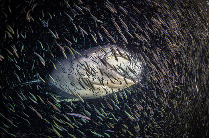 「女性五十噚獎」得主為馬來西亞攝影師Ipah Uid Lynn,他的作品《一隻鯨鯊被一群旋轉的魚群包圍》攝於馬爾地夫,在黎明時分的潛水區他捕捉到鯨鯊和魚群在水中的壯麗畫面,身為主角的鯨鯊在攝影師的精心構圖下,悠然自在地出現在畫面中央,讓人感受水中生態奧妙的一面。