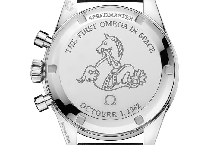 ▲實底蓋刻有超霸系列著名的海馬圖案,同時也有"THE FIRST OMEGA IN SPACE"及"OCTOBER 3, 1962"等和手錶原作相關的字樣。