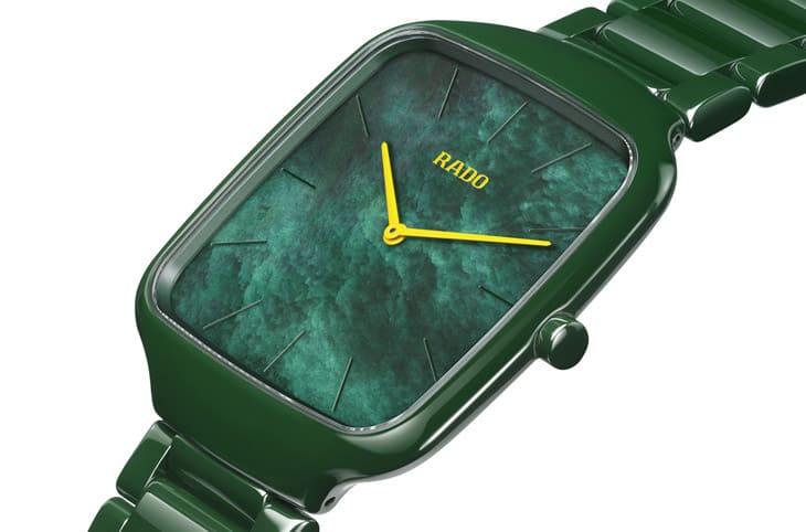 同款式中的「深邃綠」款式外觀耀眼程度與夜幕黑款式相較有過之而無不及,其錶殼、錶冠與鍊帶都是以相對少見、不過雷達表還是發揮其陶瓷專家本色研製而成的綠色高科技陶瓷製成。經過拋光後的綠色陶瓷光澤晶亮,遠遠看上去就很能吸引視覺焦點。值得一提的是,真我方形系列超薄高科技陶瓷錶深邃綠款式的面盤特別選用綠色珍珠母貝材質,線型時標也是印上同色系以深淺層次展現輔助顯時的作用。這款錶配上黃色漆面指針與品牌標誌,跳色的設計特殊且對比感超強,一目瞭然的顯時效果是這批新作的共同特徵