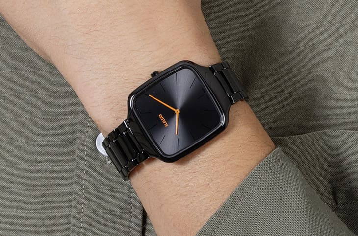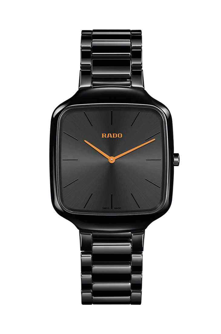 True Square真我方形系列超薄高科技陶瓷錶外觀蜿蜒曲折的設計顯得精美細膩,觸感則是光滑親膚。其中兩款「夜幕黑」款式街搭配搭配黑色面盤和黑色印製時標展現低調細膩色調,雷達表分別以兩種顏色的漆面指針為手錶點亮視覺效果,包括綠松石色或太陽橙色,除了指針還有12點方向的品牌Logo也使用相同的顏色,在黑色背景烘托下,彩色漆層便猶如城市夜景中的明亮燈光,讓人第一眼就盡收底眼。