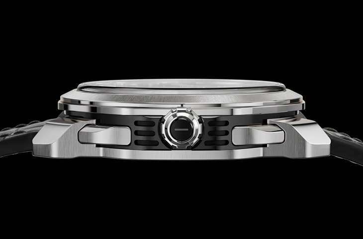 ▲運用傳聲效果絕佳的鈦金屬製作錶殼,錶殼側邊亦有局部鏤空處理,目的皆是為了強化並放大三全音報時樂音的共鳴效果。