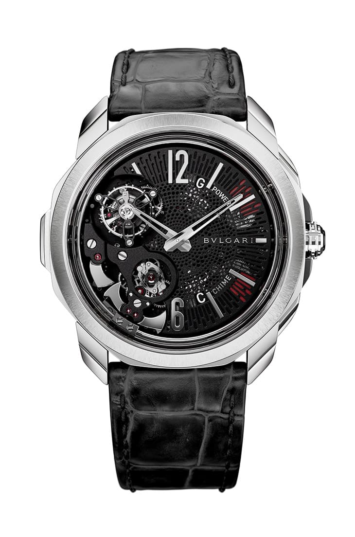 ▲面盤能一窺報時機制、陀飛輪等重要複雜功能,透過按把選擇或啟動不同報時型態,展現寶格麗當代製錶技藝之大成。