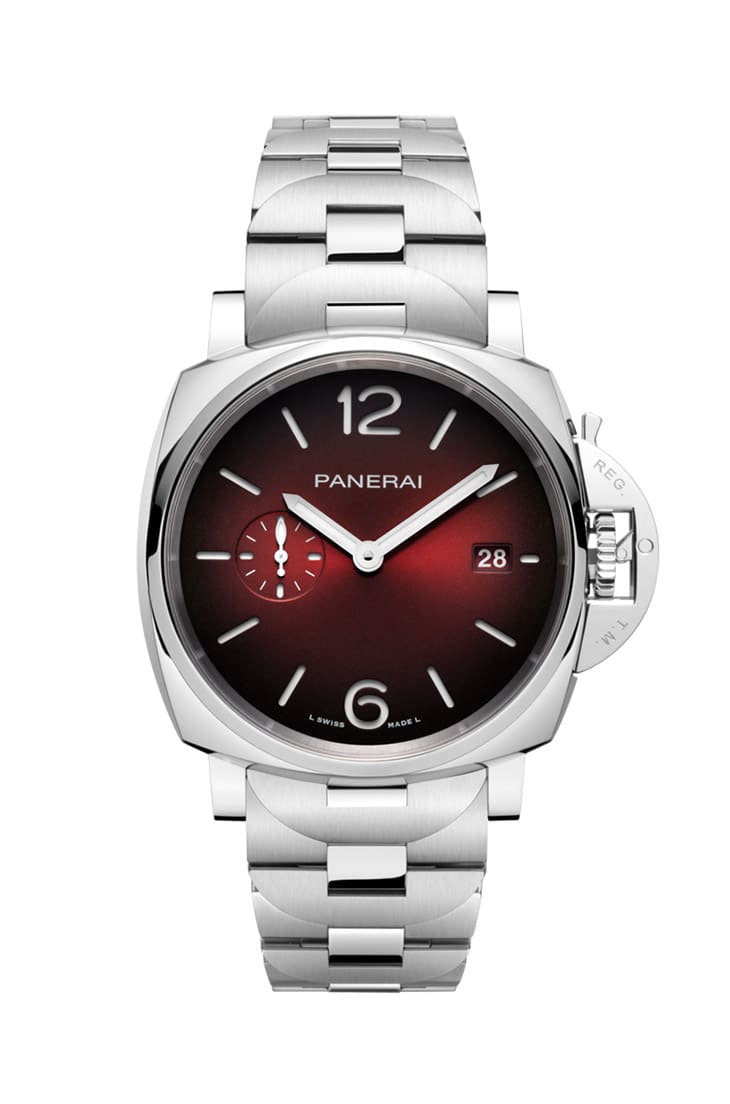 這次換上新鍊帶的按照系列和材質可以概要分為三種。其中Luminor Due系列有不鏽鋼款式3只,分別是Luminor Due Metal Bracelet PAM01508、PAM01539與PAM01387。PAM01508的錶殼為38mm,搭配白色太陽放射紋三明治面盤,上頭塗覆米白色的Superluminova®夜光塗料,而PAM01539與PAM01387都是42mm,前者的三明治面盤為酒紅色太陽放射紋,夜光塗料為白色,後者的三明治面盤則是碳灰色太陽放射紋,夜光塗料同樣也是白色的,由顏色的對比強化了清楚的視讀效果。