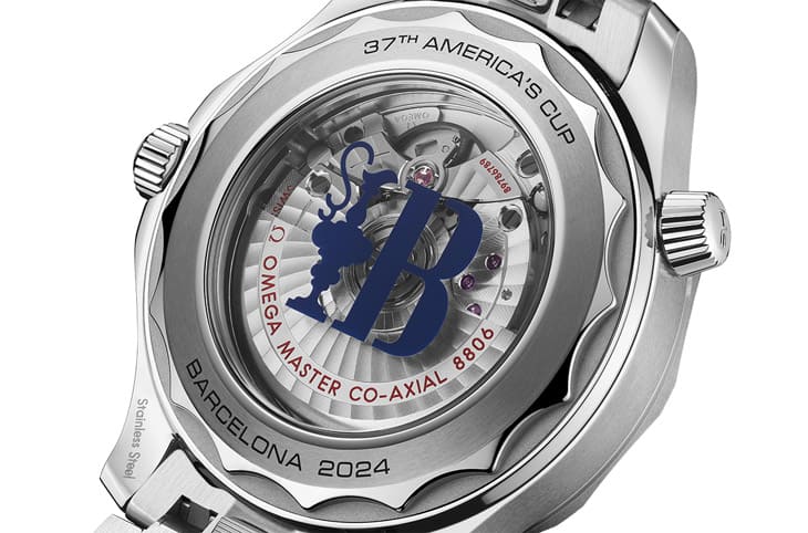 腕錶內部搭載的機芯在錶背透明底蓋下方得以一覽無遺,歐米茄精心在透明底蓋印上藍色、完整的第37屆美洲盃帆船賽,包括Auld Mug銀盃圖案與代表比賽地點巴塞隆納的字母"B",同時底蓋上下緣也改刻上美洲盃以及Barcelona 2024等字樣。海馬潛水300米腕錶美洲盃特別版內部為8806機芯,此枚機芯過去在同系列中的Nekton版、詹姆斯龐德60週年紀念版等款式中也曾出現過,其與一般版搭載的8800機芯主要差異即在於有無日期顯示,其他機芯重要規格如55小時動能、3.5Hz震頻皆一致,當然這枚機芯也是昂首通過大師天文台認證、確保抗磁性能高於15,000高斯的紮實作品,專業機能在船員進行高強度的海上作戰時能夠完美勝任,隨時提供精準可靠的時間資訊。