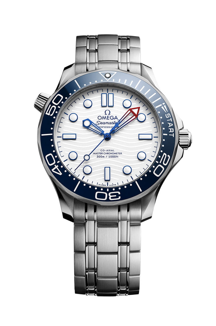 歐米茄以霧面白色陶瓷製作海馬潛水300米腕錶美洲盃特別版的面盤,表面同樣以雷射技術刻出系列招牌的波浪紋,不過一般版的波浪紋屬於陰刻、美洲盃特別版則改採陽刻形式,12點和6點方向的品牌名稱等字樣則一律呈現藍色,詮釋出帆船賽與大海的淵源。由於陽刻的浮雕風格有助於突顯立體感,這使得腕錶能夠自然吸引目光注意,在此同時亦會發覺腕錶的鏤空指針迭有驚喜,歐米茄於分針處採用藍-紅雙色漸層,尖端為紅色的分針對於佩戴者要確認倒數時間的輔助效果顯著,此外棒棒糖秒針末端的平衡器也改成美洲盃帆船賽冠軍銀盃"Auld Mug"的輪廓,低調替腕錶挹注與創作主題相符的個性。還有一點值得注意,美洲盃特別版移除了原本位在6點方向的日期顯示,暗示其內部搭載的並非與一般版同樣的機芯。