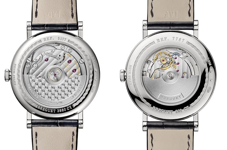 兩款Classique錶背都是透明底蓋設計,其中Classique 5177搭載的是777Q自動機芯,這枚機芯的18K金自動盤擁有手工機刻雕花「馬賽克星空」圖案,品牌另在自動盤邊緣加上「Breguet édition spéciale寶璣特別版」字樣,突顯出這種花紋難能可貴之處,機芯內部蘊含矽游絲,帶來優異的抗磁效果,同時擺輪震頻達4Hz、動力儲存則有55小時。