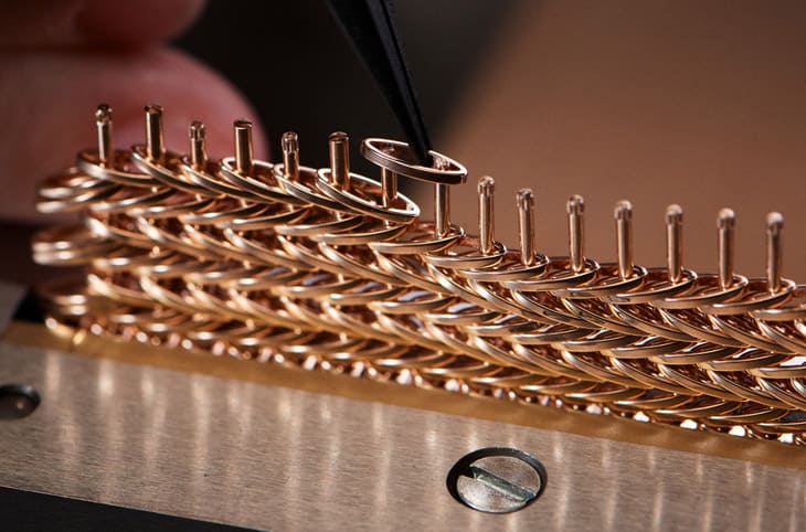 第一眼看到5738/1R-001這種猶如編織成形的金屬鍊帶,感覺除了精緻之外,還有舒適,因為可以預期它能夠服貼地順著手腕曲線彎曲,但你大概沒想到,品牌為了研發這種鍊帶,共花了15年時間才大功告成,可見這種鍊帶的製作難度非同小可。IG上有鐘錶部落客分享了一段影片,內容剛好有關5738/1R-001的製作過程,看完後不難理解為什麼品牌會花這麼久的時間才研發完成,因為光看它的製作過程就有夠費力的了,當初要找到製作的竅門,肯定需要經過長時間的摸索、試誤才有辦法達到百達翡麗預想的目標。