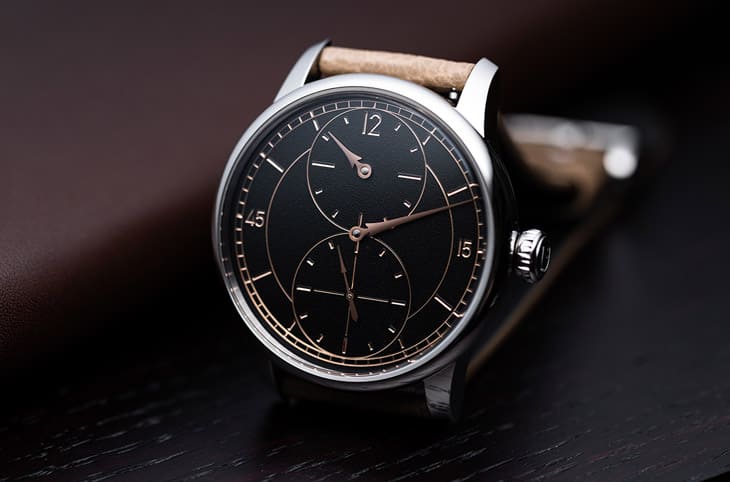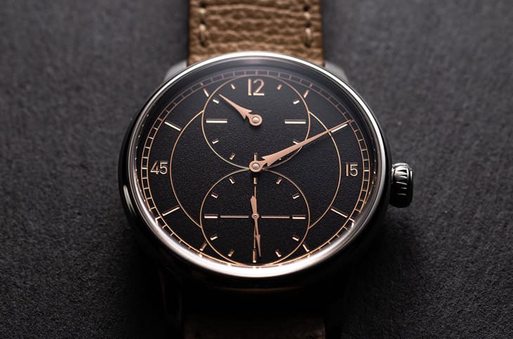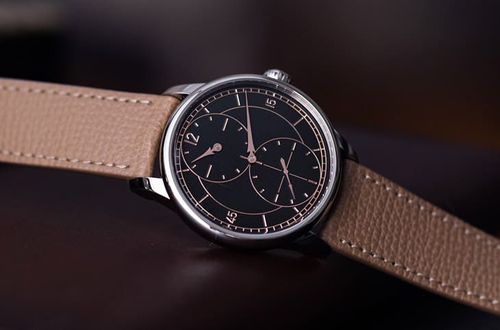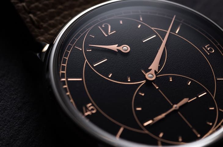 手錶黑色面盤經過精心打磨呈現粒面質感,LOUIS ERARD於其上刻鑿出時標、阿拉伯數字與軌道式刻度並添上玫瑰金鍍金,從面盤外圍就可以發現一層疊著一層的圓形概念,一直延伸到面盤中間,至此三枚顯示指針的軸心分別佔據三個位置,由12點方向往6點方向依序垂直排列顯示時、分、秒等時間資訊。
