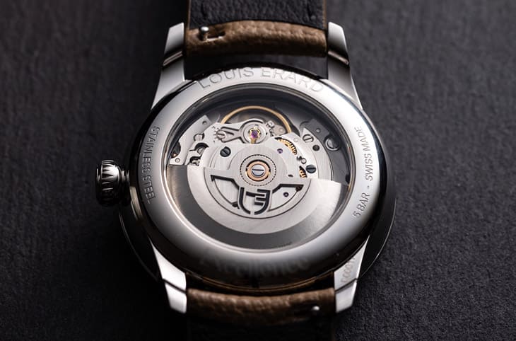 Le Régulateur Gravé Noir搭載通用機芯Sellita SW266-1,錶背有透明底蓋可以讓人欣賞機芯組件,其中LOUIS ERARD將局部鏤空的自動盤融入"LE"縮寫字樣,強調機芯經過個性化的調整,從中表現出紮實的製錶工藝。市面上擁有三針一線顯示的作品不多,如果出自大品牌手筆又往往要價不菲,Le Régulateur Gravé Noir秉承LOUIS ERARD堅持以合理價格打造優質手錶的理念,在產品定價上不因為重新定位產品線而出現巨變,錶迷們還是可以兼顧獨特性、工藝品質以及價格,入手像這款錶一樣的優質作品。