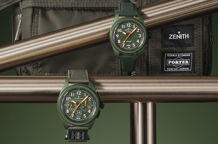 ZENITH找上了日本吉田包PORTER合作,以Pilot系列為基礎,融合和吉田包也有關係的旅行主題,催生出兩款手錶作品,包括Pilot Automatic PORTER自動錶以及Pilot Big Date Flyback PORTER大日期飛返計時碼錶,同時PORTER這邊也出了與真力時聯名的包款,雙方各自在擅長的領域,表現出聯名企劃誘人的魅力。