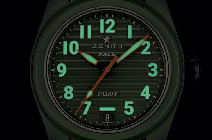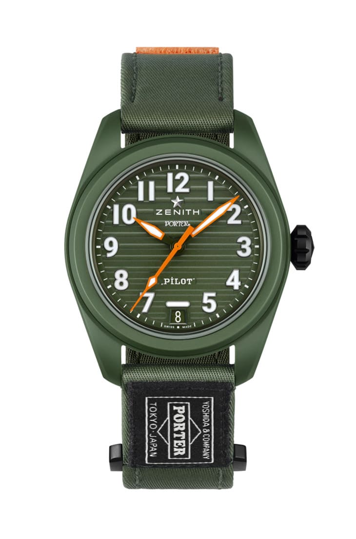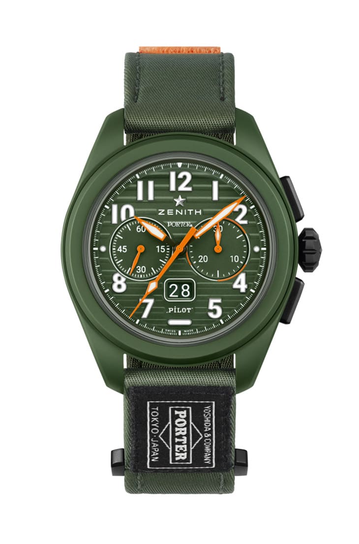 回到手錶本身,兩款中較入門的Pilot Automatic PORTER自動錶,它的綠色陶瓷錶殼經過霧面處理,展現粗獷豪邁的運動風格,至於大型的錶冠則是經過黑色PVD處理,和綠色錶殼搭配蠻合拍的。手錶面盤飾有靈感來自以波紋金屬板拼接而成的古董飛機機身,它的顏色與錶殼一致,另外在面盤12點方向的ZENITH標誌下也多加了PORTER標誌,即使換上沒有布標的橡膠錶帶,還是可以展示出聯名作品的身份。Pilot Automatic PORTER自動錶面盤上的阿拉伯數字時標都填上白色的Super-LumiNova夜光塗層,當然指針上也不例外,ZENITH特別將三針設計成橘色,在綠色面盤烘托下閱讀時間輕鬆寫意,而且選用橘色別有用意,因為這是許多吉田包內襯的顏色,這讓手錶看在吉田包粉絲眼裡超有親切感。