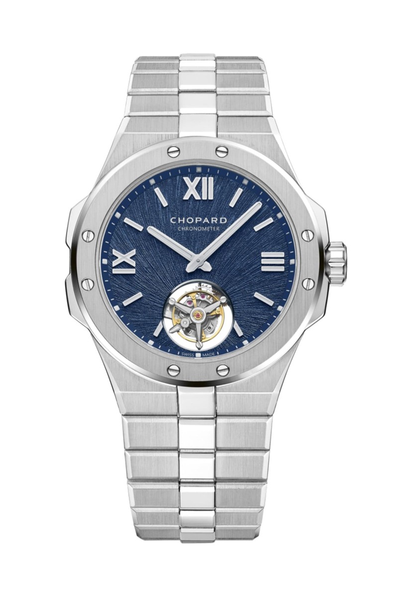 目前Alpine Eagle系列工藝規模最高的作品非飛行陀飛輪腕錶莫屬。以Lucent Steel A223精鋼製作的款式尺寸41mm與家族中的三針款相同,但令人意想不到的是,Alpine Eagle Flying Tourbillon錶殼厚度僅8mm還比三針款更薄!以蕭邦獨家的精鋼材質製作錶殼好於它的低致敏性以及堅固耐用效果,蕭邦透過重熔工序讓Lucent Steel A223精鋼呈現出迷人的光澤感也和一般市面上的精鋼材質有細膩的差異,讓人對腕錶充滿好感。錶款面盤同樣以阿萊奇藍色裝點靈感源自老鷹虹膜的放射紋理,蕭邦為了突顯陀飛輪裝置的工藝亮點,因此特別調整過紋理樣式,將放射的原點從面盤軸心改為6點方向的陀飛輪,如此佩戴者視線能夠自然聚焦至自轉不息的陀飛輪框架——此處精心添上一枚小巧的指針,因此替陀飛輪延伸出小秒顯示的作用。