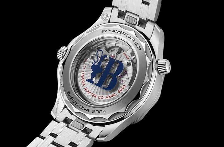 歐米茄2024年再度擔任美洲盃帆船賽的官方計時,他們為了本屆賽事打造出一款海馬潛水300米美洲盃特別款,錶款以不鏽鋼材質製成,搭配藍色陶瓷錶圈,歐米茄特別改造了錶圈,把原本60分鐘刻度的前15分鐘改成兩個5分鐘預備段和一個啟動段——啟動段設有賽船靈感的旗幟圖案作為代表。令人開心的事,歐米茄還在這款作品中開啟海馬潛水300米融入錶帶快拆系統,在錶背上下錶耳附近會找到按把,而且無論不鏽鋼鍊帶或是橡膠錶帶版本都有快拆,對錶迷而言絕對是個福音。