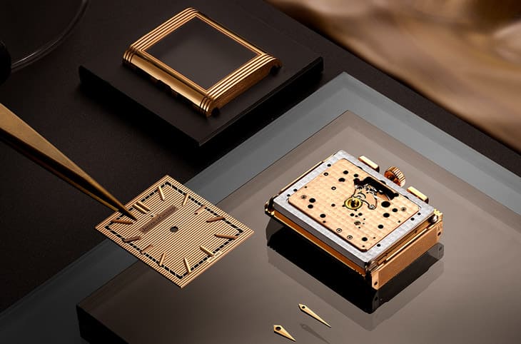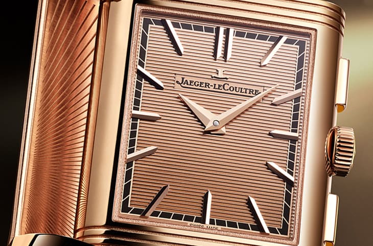 手錶的玫瑰金面盤運用雷射技術刻出一條一條的水平飾紋,剛好與錶殼上下各3道的水平條紋形成內外呼應。積家將軌道式刻度填上黑色強化視讀效果,同時梯形鑲貼時標、太子妃式指針經過加工打磨後呈現出的立體感,放在同材質的面盤上依舊可以清楚閱讀,將玫瑰金的單色利用不同的加工修飾手法,製造出自然的層次,看起來還是非常清楚易懂。