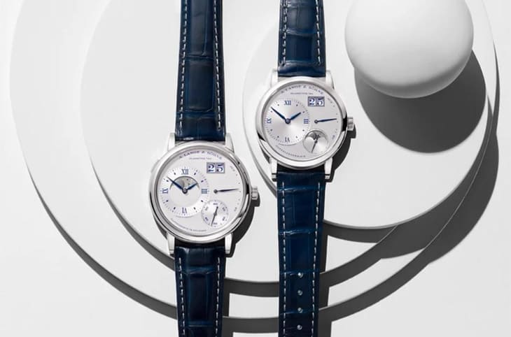 嶄新發表的LANGE 1 30週年紀念錶運用材質和配色展現獨特個性,其中鉑金款式搭配首次出現在系列中的黑色縞瑪瑙面盤以及黑色鱷魚皮錶帶,而玫瑰金款式則是藍色925銀面盤與藍色鱷魚皮錶帶相呼應。黑面設計的大日期視窗為黑底白字、藍面設計則為白底黑字,朗格分別採用鍍銠黃金以及黃金打造兩款作品面盤上的時標、指針與大日期視窗邊框等零件,使其與錶殼材質顏色和諧一致。腕錶整體散發內斂高雅的優異質感,這正是LANGE 1過去30年來受到收藏家青睞的一大原因。