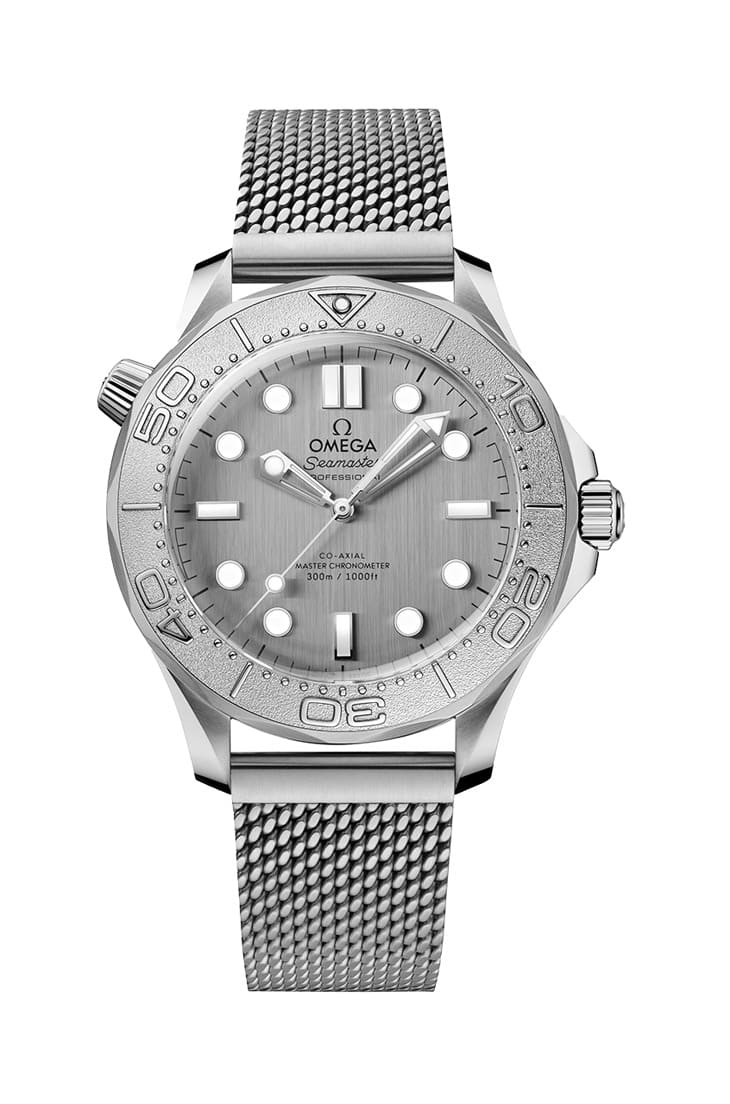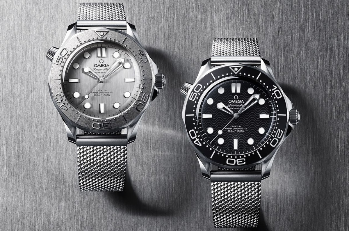 除了鋼殼、黑面搭米蘭帶的款式,新款海馬潛水300米也還有鋼殼、黑面搭黑色橡膠錶帶的版本(不同錶帶版本定價會有變化),此外歐米茄也還新增了另一款同樣是不鏽鋼材質製作、錶徑相同,但是錶圈改用鈦金屬材質並透過雷射蝕刻凸面潛水刻度,表面還加上粒紋處理,類似的造型最早出現在海馬潛水300米鈦鉭限量版上;而它的面盤也不是海馬潛水300米系列標準的陶瓷,改成PVD不鏽鋼拉絲處理——這種造型目前在系列中首次出現,比起丹尼爾克雷格搶先戴的黑面更有新意。鈦金屬錶圈款式和前面介紹的黑圈黑面款式一樣都有米蘭帶版本和橡膠錶帶版本,後者換成與面盤顏色接近的灰色以達成更和諧一致的視感。