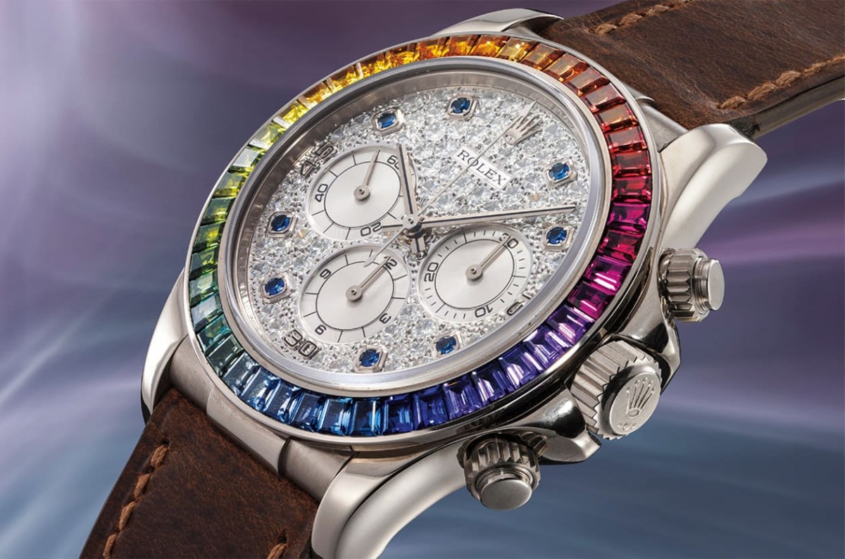 這款創紀錄的Cosmograph Daytona "Rainbow" 16599白金款為1994年生產,當時勞力士是以一次性發行策略推出,手錶的亮點在於錶圈鑲有深紅色到紫色的漸變色藍寶石、面盤則鑲滿鑽石以及藍寶石時標,搭載的是以真力時El Primero為藍本的4030自動機芯,説得直白點就是2010年代Daytona彩虹圈的始祖(早推出約20年),劃時代的設計以及代表性不言而喻。