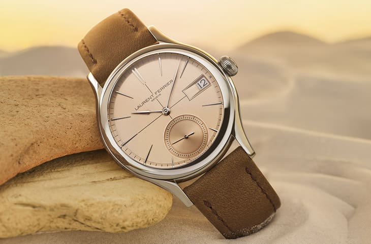LAURENT FERRIER替手錶配置的玫瑰色面盤同時擁有沙色與泥土色色澤,這種中性色調與大自然和土地緊密相連,象徵著穩定與寧靜的氛圍,也讓人想到早期時計那種古色古香的細緻格調,由於面盤有多種飾面,因此能讓沙色、泥土色隨著光線照射呈現由淺至深的變化。