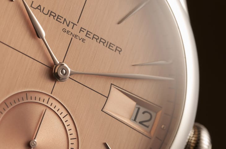 手錶的沙色面盤上設有水滴形白金時標,與修長的指針搭配相輔相成,3點方向的日期顯示並不稀奇,但是LAURENT FERRIER運用一種平緩下沉的斜坡造型吸引佩戴者將視線移至白底黑字的日期出,包括日期窗周圍和面盤中央都有黑色框線或十字交叉線,各種設計力求縝密與細緻,展現出LAURENT FERRIER受到收藏家青睞的重要原因。