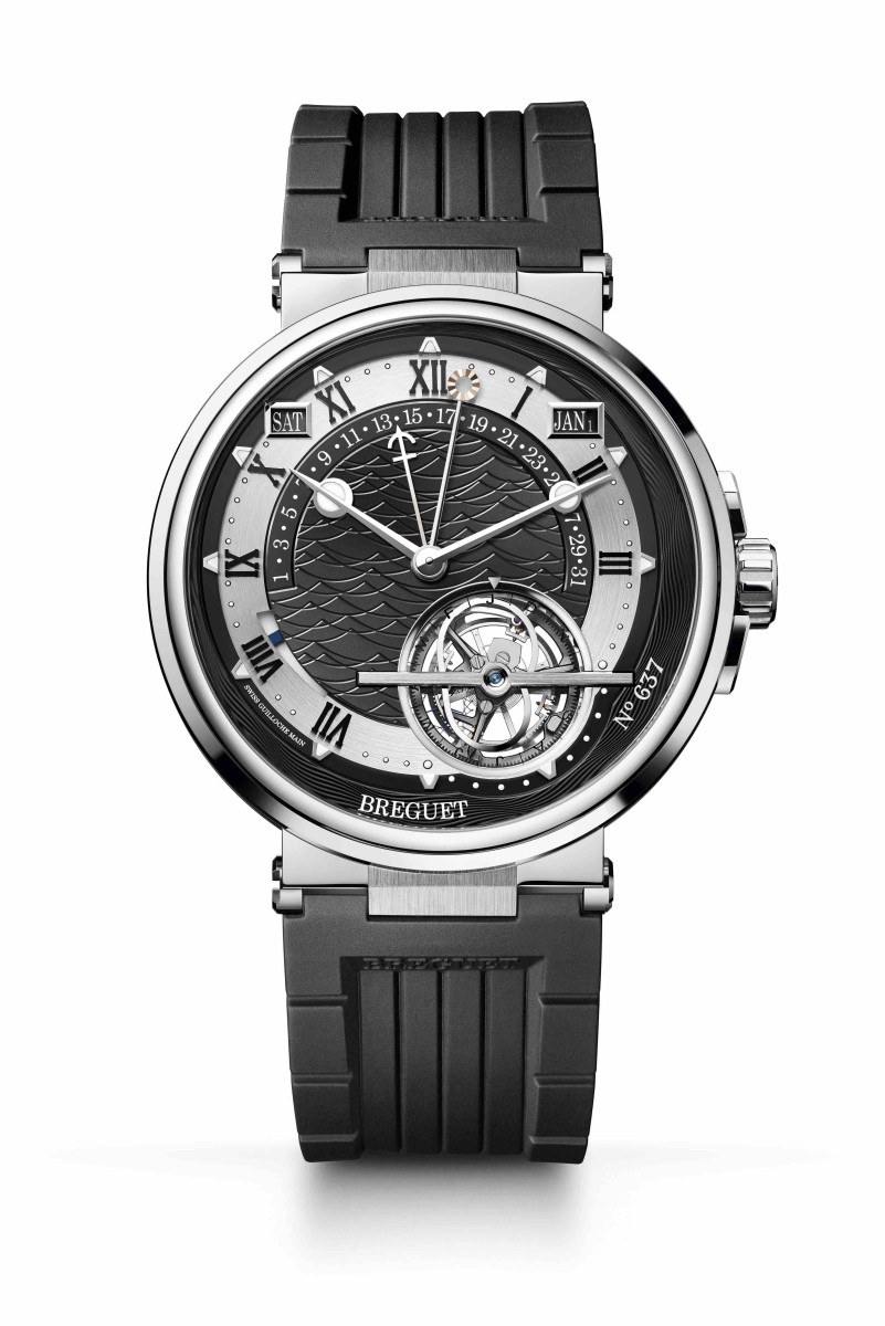 Marine 5887同樣用堅固的鉑金打造錶殼,銀白色調搭配對比感強烈的黑色面盤,呈現在外圍的刻度環、中央圓盤機刻雕花的波浪紋路。此錶搭載581DPE自動上鍊機芯,擁有時間等式、萬年曆、陀飛輪功能,卻能在面盤大面積的黑色詮釋之下,呈現井然有序又簡潔明快的視覺感受,搭配黑色橡膠錶帶增添頂級傑作不同於凡的魅力,極為適合追求個性化與動感生活的腕錶愛好者。