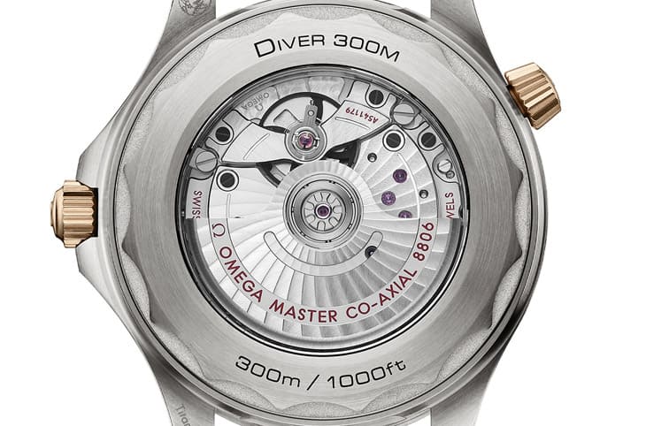 手錶背面與不久前新出的海馬潛水300米都採透明底蓋設計,因此內部的8806機芯便可以一目瞭然,首先會注意到的像是自動盤、底板和擺輪橋板表面的阿拉伯式日內瓦波紋,以及零件邊緣基本但又重要的倒角拋光、拉絲等修飾,同時也會看到黑色的同軸擒縱系統以及其結構中的矽游絲等,這間接代表機芯的走時水準更勝常聽到的瑞士天文台認證,而是在達到各方面表現、尤其抗磁性能方面傲視多數機芯水準(大於15,000高斯)的瑞士聯邦計量科學研究所(METAS)施測的大師天文台認證。