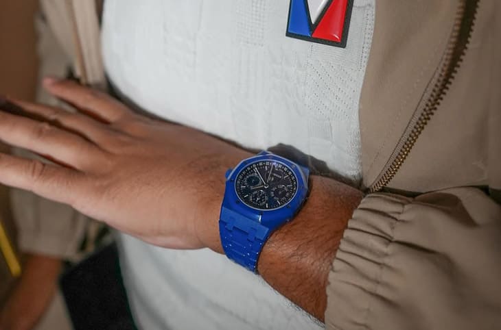 首先是DJ Khaled的部分,他帶了一款顏色很醒目的藍色手錶,錶壇有製作這種藍色系手錶的牌子不多,加上DJ Khaled最近在社群平台上狂曬這只錶,因此答案很明顯就是愛彼在皇家橡樹系列50週年時推出的藍色陶瓷Royal Oak Perpetual Calendar。這款用異色陶瓷打造的作品,包括錶殼、鍊帶等都是硬度相當高的陶瓷,外觀又是搶眼的藍色調,佩戴在手上絕對沒辦法低調到哪去。