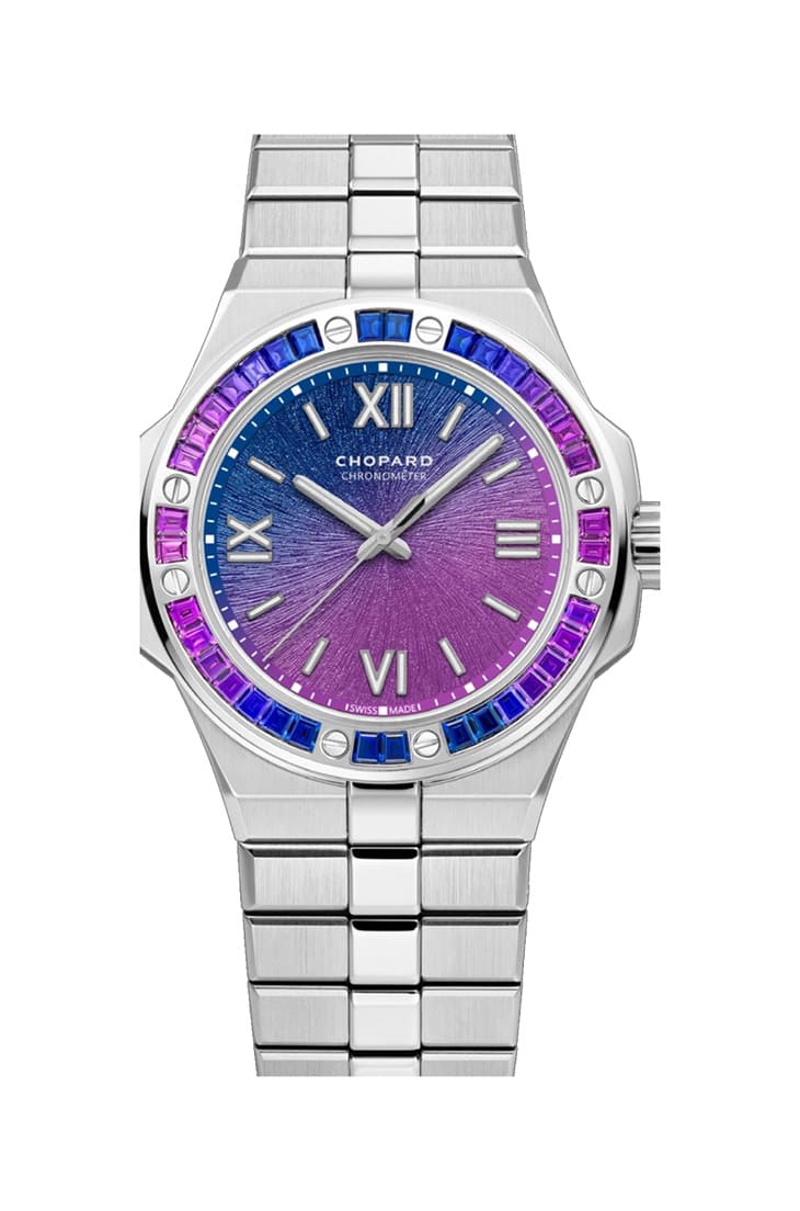這次CHOPARD和Art In Time攜手打造的超限量版只發行15組,手錶的兩種尺寸主要都是以Lucent Steel A223不鏽鋼為主,不過36mm款式的錶圈另以白金製作,因為它的表面還會加碼鑲上寶石,與41mm款式素雅的不鏽鋼錶殼做出區隔。具體而言,36mm款式的錶圈鑲上了36顆矩形切割藍寶石,這些寶石呈現由紫色到藍色的漸變效果,看起來賞心悅目,也和面盤的稀有特殊色互相呼應。