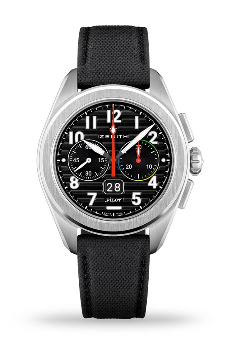 過去Pilot飛行錶面盤被源自Louis Blériot佩戴那款飛行錶以及1930年代經典Type 20飛行錶樣式的大型阿拉伯數字時標與復古指針造型等兩大元素佔據焦點,發展到新版之後,前述兩大元素都不復見,但也因此真力時驚喜放上了立體的水平條紋裝飾面盤(乍看還有點像RIMOWA行李箱),加上同樣走大型路線的阿拉伯數字時標與大日期顯示等,還有計時大秒針與計時分針塗成紅色的區隔設計等,在在都讓手錶面盤煥發出嶄新的識別特色。有趣的是,3點方向的計分小錶盤刻度飾有綠、黃、藍等三色,與前述的紅色指針設計明顯有要致敬真力時在1990年代末期所推出El Primero Flyback Rainbow的意思,因此要說手錶是純粹現代設計也不盡然,因為它仍然巧妙融入了ZENITH過往經典設計的元素,在新鮮感中保有令人熟悉的記憶。